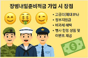 국방부와 여러 금융기관이 함께 만든 특별한 상품으로, 전역 후에 목돈을 마련할 수 있도록 도와줍니다.- 정부가 이자를 추가로 지원해줍니다.