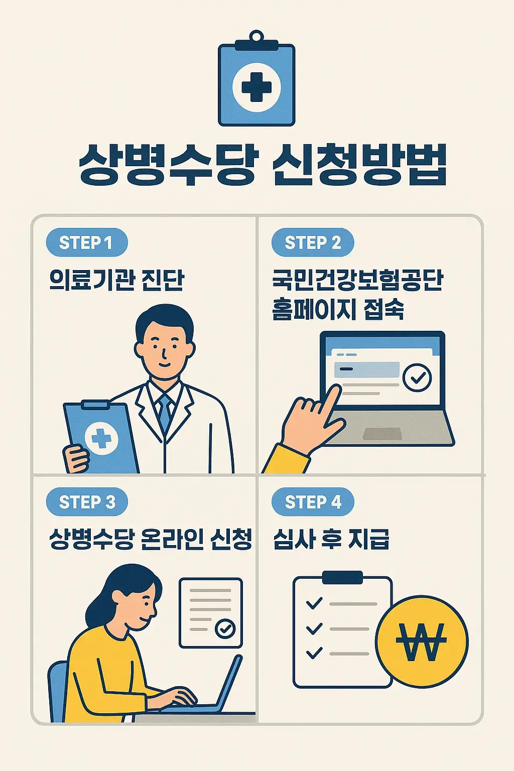 상병수당 신청방법은 간단하지만, 실질적으로 많은 분들이 자격 여부를 모르거나 신청 시기를 놓쳐 수급 기회를 놓치고 있습니다.